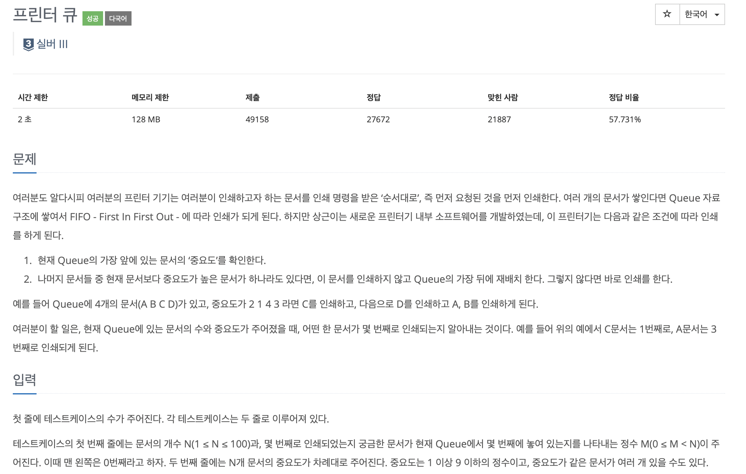 이 요상한 큐 문제는 각 요소마다 중요도가 있어서, 자기보다 더 중요한 요소가 존재하면 무조건 맨 뒤로 이동시키게 된다. 그래서 지정된 요소가 몇 번째로 출력이 되는가를 알아내는 프로그램을 작성하는 것이 이 문제의 목적이 되시겠다.