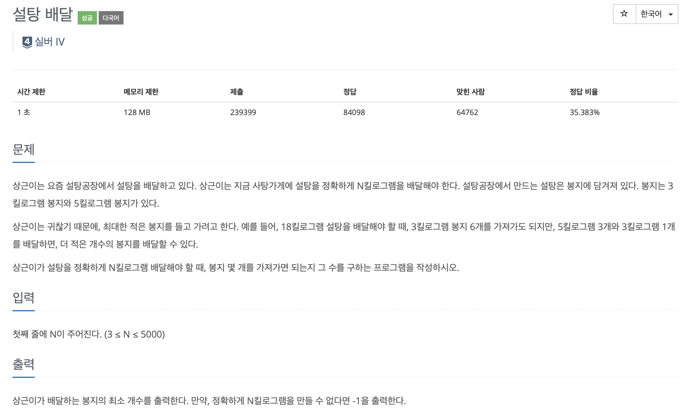 상근이는 요즘 설탕공장에서 설탕을 배달하고 있다. 상근이는 지금 사탕가게에 설탕을 정확하게 N킬로그램을 배달해야 한다. 설탕공장에서 만드는 설탕은 봉지에 담겨져 있다. 봉지는 3킬로그