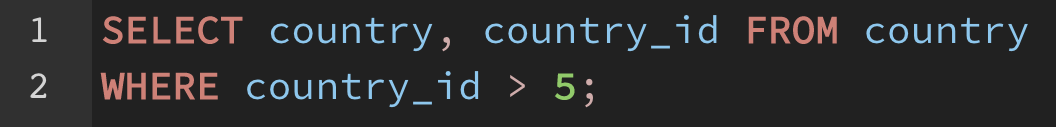 다른 예제로, 국가 번호가 5보다 큰 국가의 이름과 국가 번호를 호출한다고 해보자. 그렇다면 이런 식으로 작성할 수 있다.