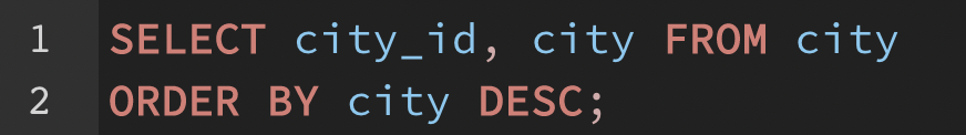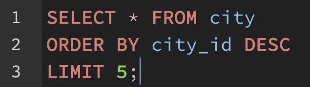 예를 들어, city 테이블에 있는 city_id를 내림차순으로 정렬하고 상위에 있는 5개의 행들만 추출한다고 생각해보자. 그렇다면 이렇게 해결할 수 있을 것이다.