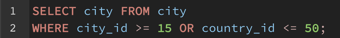 예를 들어서, 도시 번호가 15 이상이거나 국가 번호가 50 이하인 도시의 이름을 출력한다고 해보자.