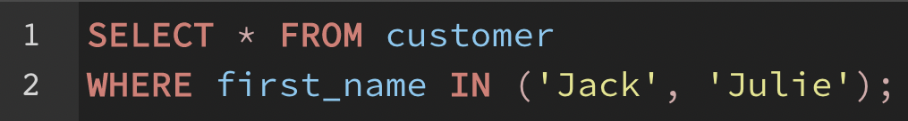 예시를 통해서 확인해보자. 만약 고객의 이름 중에서 Jack과 Julie와 같은 이름이 있는지 확인하고자 한다. 그럴 때는 문제를 이렇게 해결할 수 있다.
