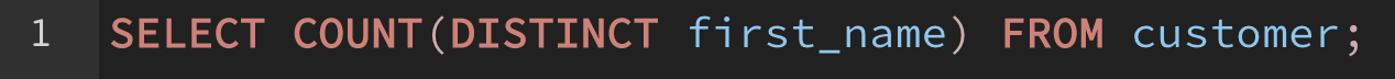 COUNT문을 사용하는 예제를 살펴보자. 예컨대, 2)에서 예제로 들었던 고객의 이름 중 중복되지 않는 이름의 개수를 구한다고 생각해보자.