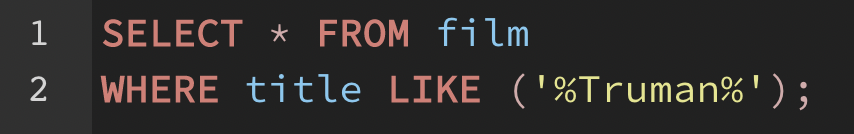 %기호는 다음과 같은 상황에서 사용될 수 있다. 영화 제목에 'dive'라는 단어가 들어가는 영화를 찾는다고 해보자. 그럴 때는 WHERE title LIKE ('%dive%')와 같은 식으로 사용될 수 있다. 물론 dive로 시작하는 영화를 찾는다고 할 때는 ('dive%')를 사용해야 하고, dive로 끝나는 영화를 찾는다고 하면 ('%dive')를 사용한다.