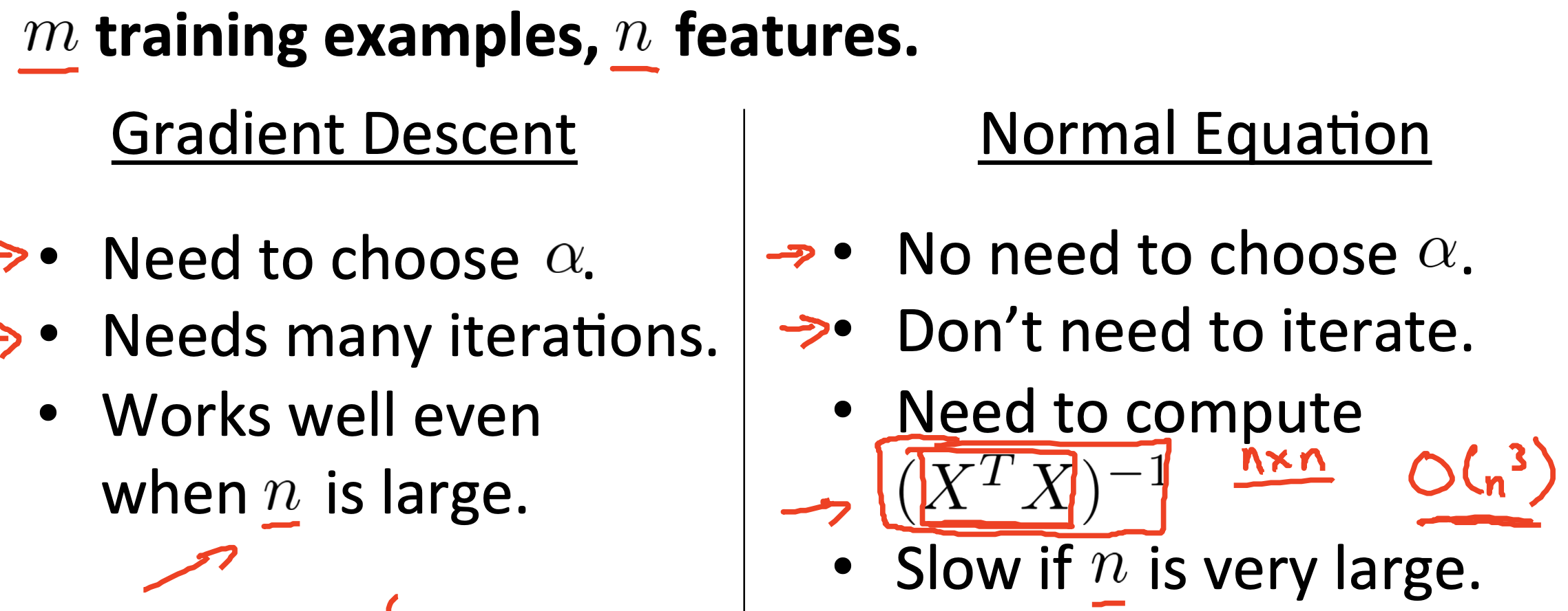 경사하강법에서는 학습율을 정해야 하고, 많은 반복이 필요하지만 변수의 개수가 클 때도 잘 작동한다는 특징이 있다. 정규방정식은 학습율을 정할 필요가 없고, 반복할 필요도 없지만, $O(n^3)$의 시간복잡도를 가지는 $( X^{T}X)^{-1}$를 계산해야 하기 때문에 변수의 개수가 클 때는 느려진다는 단점이 있다.