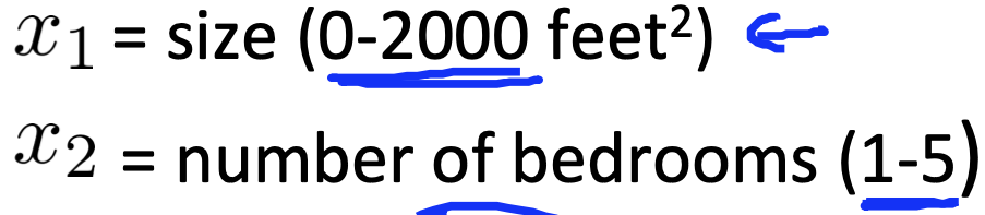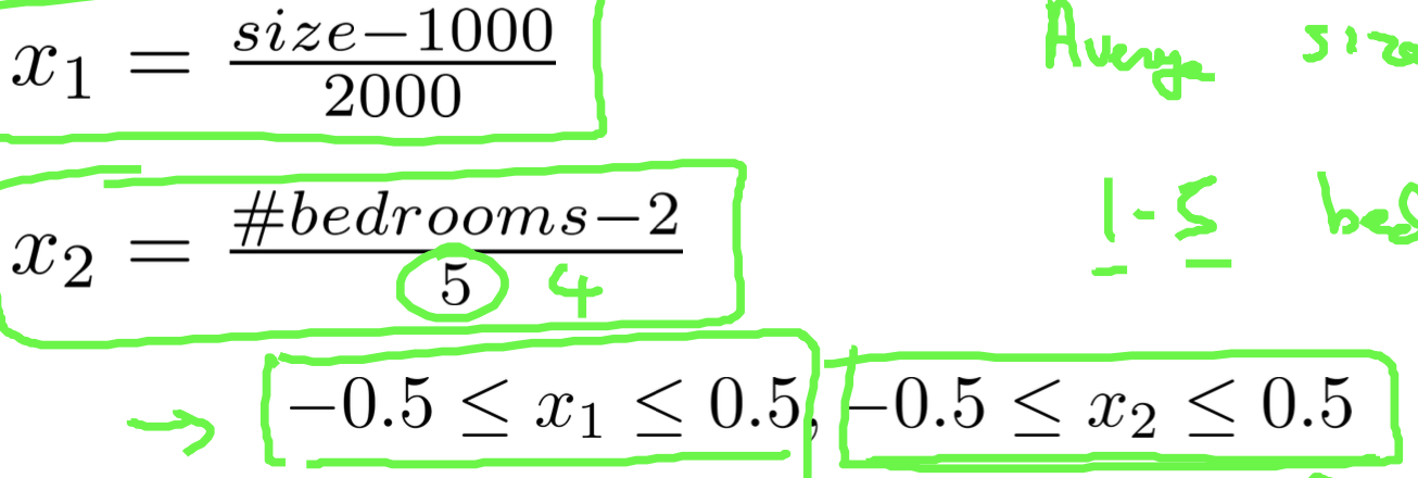 첫번째 변수는 바로 방의 크기를 나타내는 변수로, 변수의 초기 범위는 0에서 2000 피트제곱까지이다. 두번째 변수는 방의 개수를 나타내는 변수로 변수의 초기 범위는 1에서 5개이다. 두 변수를 Mean Normalization을 통해서 스케일링을 해본다면 다음과 같이 나타낼 수 있겠다.