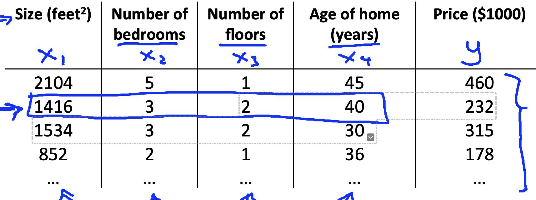 예컨대, 다음 사진과 같은 상황에서 $x^{3}$은 training example의 세번째 열인 Number of floors를 의미하게 된다. 즉, [1, 2, 2, 1 ...]을 의미하게 되는 것이다.