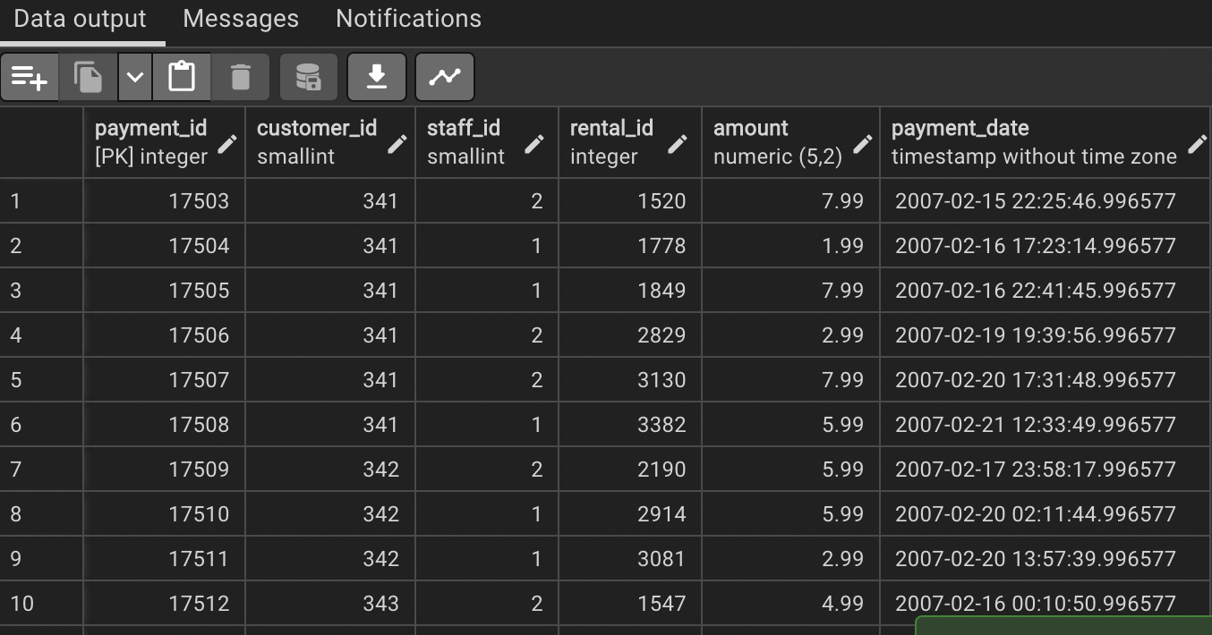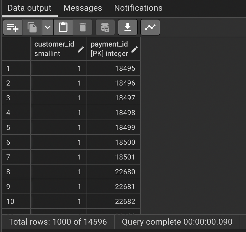 두 테이블에 공통적으로 있는 열은 customer_id가 있다. 그렇다면 두 테이블에 모두 존재하는 고객의 payment_id와 customer_id를 추출하여 customer_id의 오름차순대로 정렬해보자.