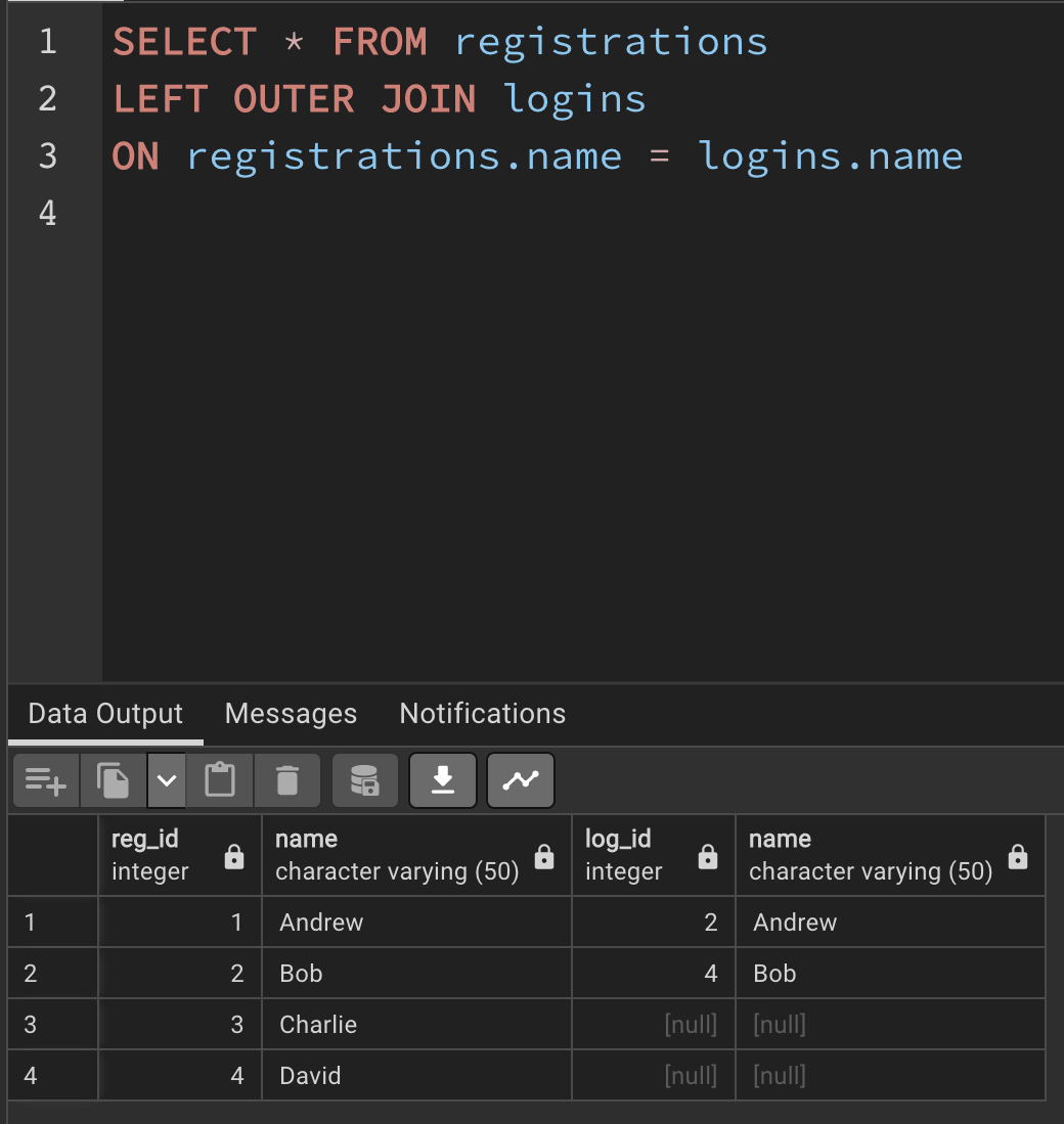 registrations에 저장된 이름은 Andrew, Bob, Charlie, David이고, logins에 저장된 이름은 Xavier, Andrew, Yolanda, Bob이다. 이 두 테이블을 name을 기준으로 FULL OUTER JOIN을 해보도록 하겠다.