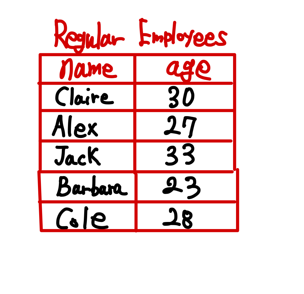 두 개의 테이블이 있다고 하자. 하나는 정규직 직원들의 명단을 관리하는 테이블이고, 다른 하나는 계약직 직원들의 명단을 관리하는 테이블이다. 계약직 직원 중 Barbara와 Cole을 정규직 직원으로 편입하려고 한다. 이럴 때 명단을 UNION 연산자를 통해 합칠 수 있다. UNION 연산자를 통해 합치면 다음과 같은 모습을 띠게 된다.