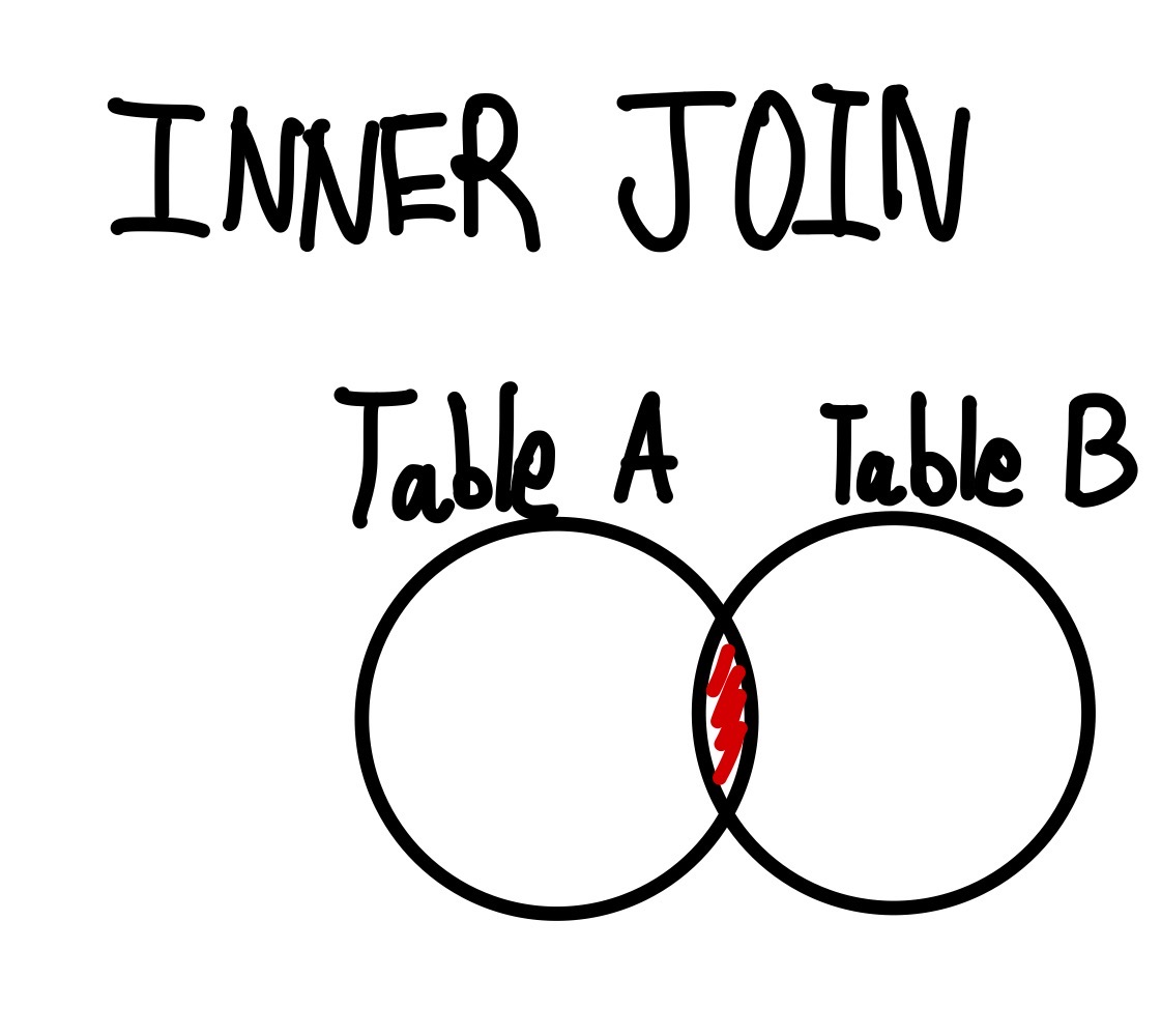 5번 섹션에서는 INNER JOIN에 대해서 살펴보자. 우선 INNER JOIN이란 Table A와 Table B가 있을 때 두 테이블의 교집합을 의미한다. 벤 다이어그램의 형태로 나타내면 다음과 같다.