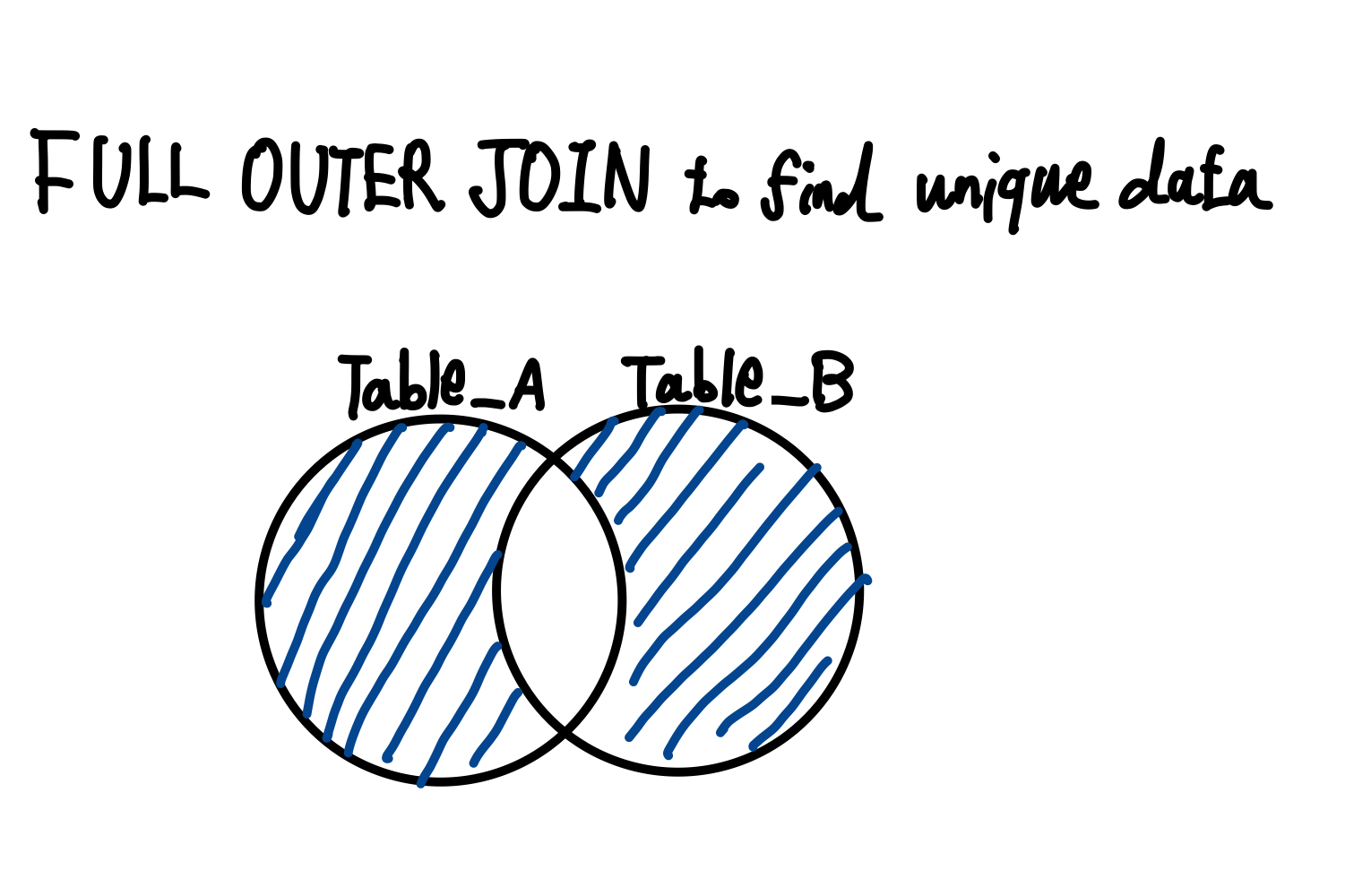 그렇다면 빈 곳에 null을 넣어주는 FULL OUTER JOIN의 성질을 이용한다면 서로에게 고유한 데이터들도 구할 수 있지 않을까? 정답이다. 그럴 때는 앞서 배웠던 WHERE문을 이용하면 된다. 참고로, WHERE문은 JOIN이 되고 난 후에 작동한다.