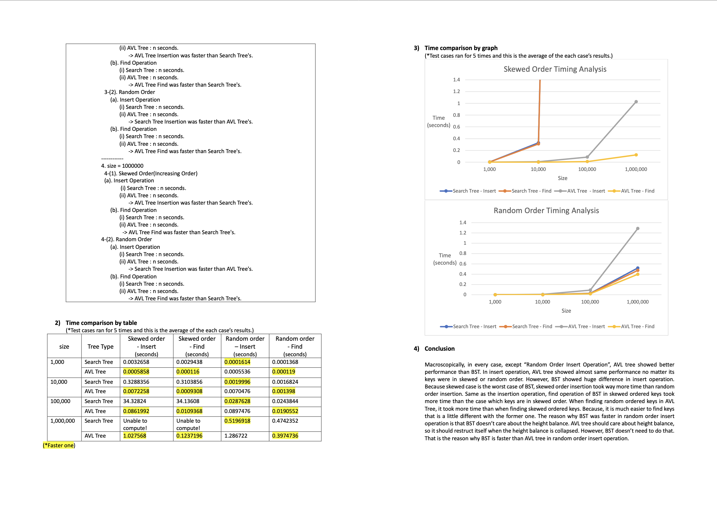 대부분의 구현을 책에서 찾을 수 있어서 그렇게 어렵지는 않았으나 restructure 함수를 구현하는데는 애를 좀 먹었다. 여러가지 케이스들을 생각해야 됐기 때문이다. 오히려 레포트를 쓰는 것이 더 힘들었던 것 같다. 함수가 구현되어 있는 방식 때문에 size가 커질 경우에 본인 컴퓨터에서 작동이 잘 되지 않았던 부분도 있었다. 그래도 실제로 AVLTree와 BST를 구현해볼 수 있었다는 것이 이번 과제의 장점이 아닐까 싶다.
