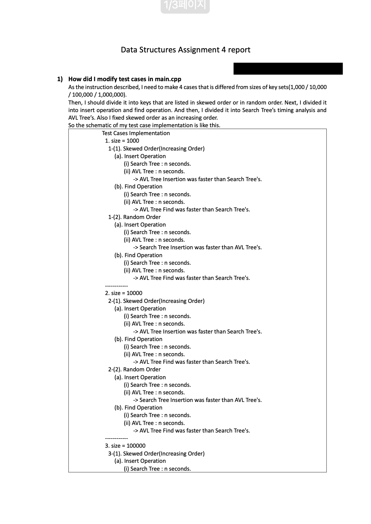 마지막 과제는 바로 Search Tree를 구현하는 것이었다. 일반적인 BST와 AVL Tree들을 구현해서 실행시간을 비교하고 레포트까지 작성하는 것이 과제였다. 사실 이번 과제는 교재(Data Structures&Algorithms in C++ 2nd Edition by Michael T.Goodrich, Roberto Tamissa, David M.Mount)에서 많은 도움을 얻었다. 교수님께서도 그래도 된다고 하시기도 하셨고, 스켈레톤 코드도 상당 부분 유사했다. 그러나 완전히 동일하지는 않았고 어느 정도 응용을 했어야 했다.